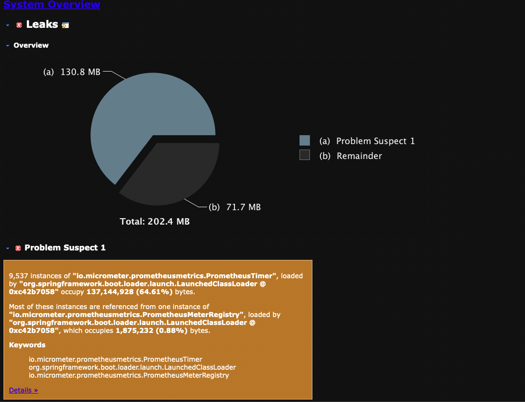 io.micrometer.prometheusmetrics.PrometheusTimer 인스턴스가 힙을 130MB나 점유하고 있었다.