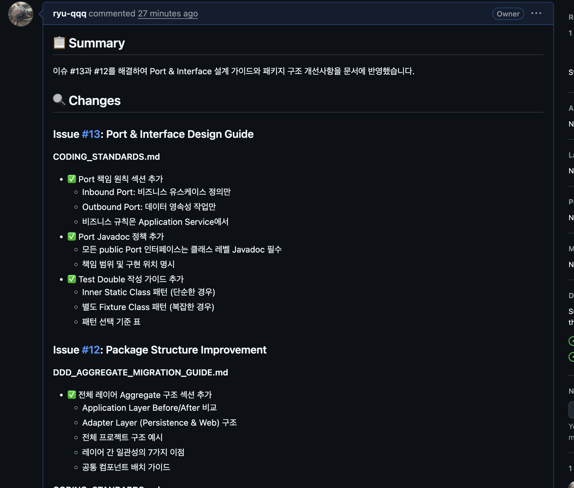 - 헥사고날 순서: Domain → Application → Adapter 순서로 정렬